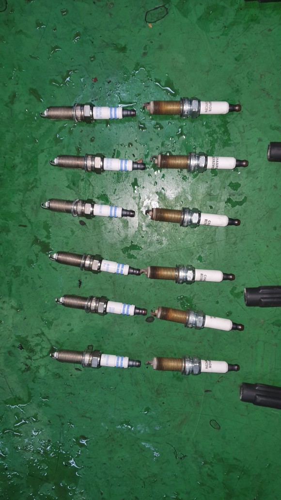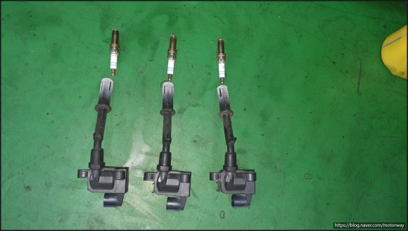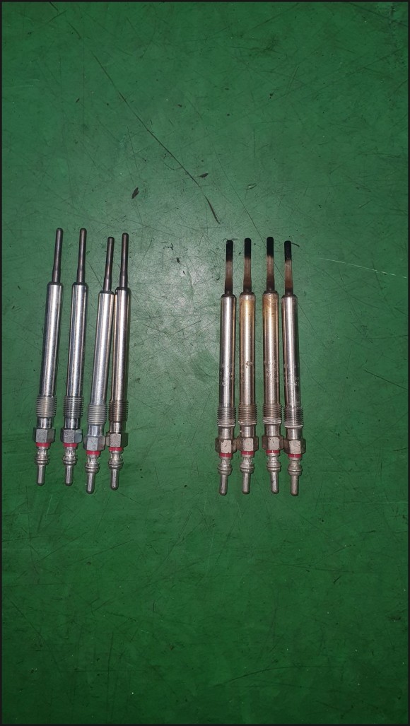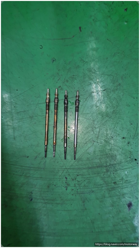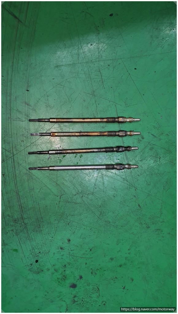 26. 27 예열플러그를 탈착하여 보니 예열플러그가 하나는 괜찮고 세개가 불량하여 교환하기로 하여 탈거된 사진