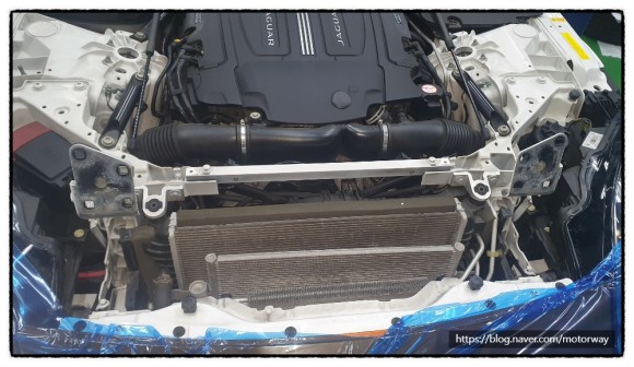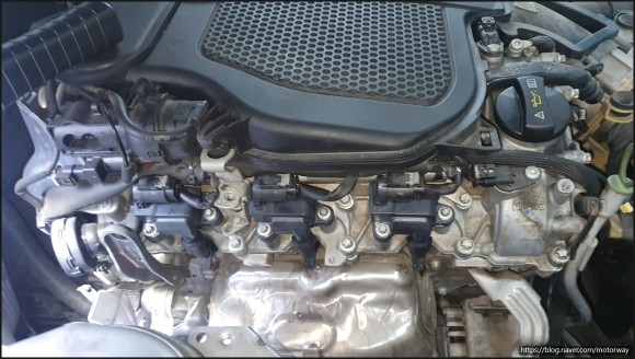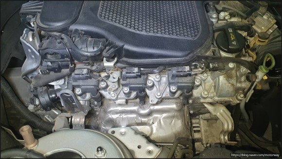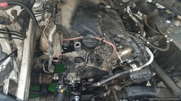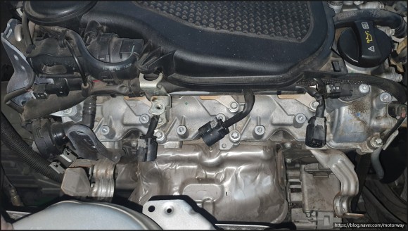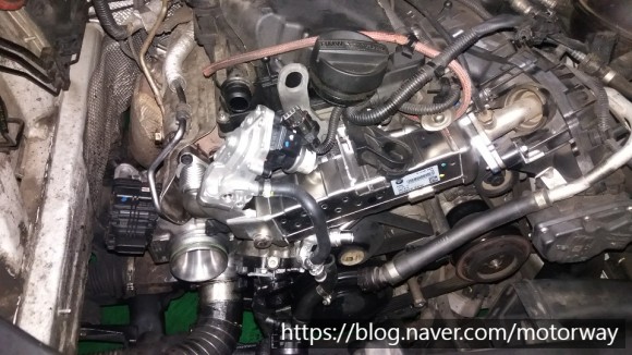 29. 흡기 매니폴더와 냉각수 파이프 등을 장착중인 사진