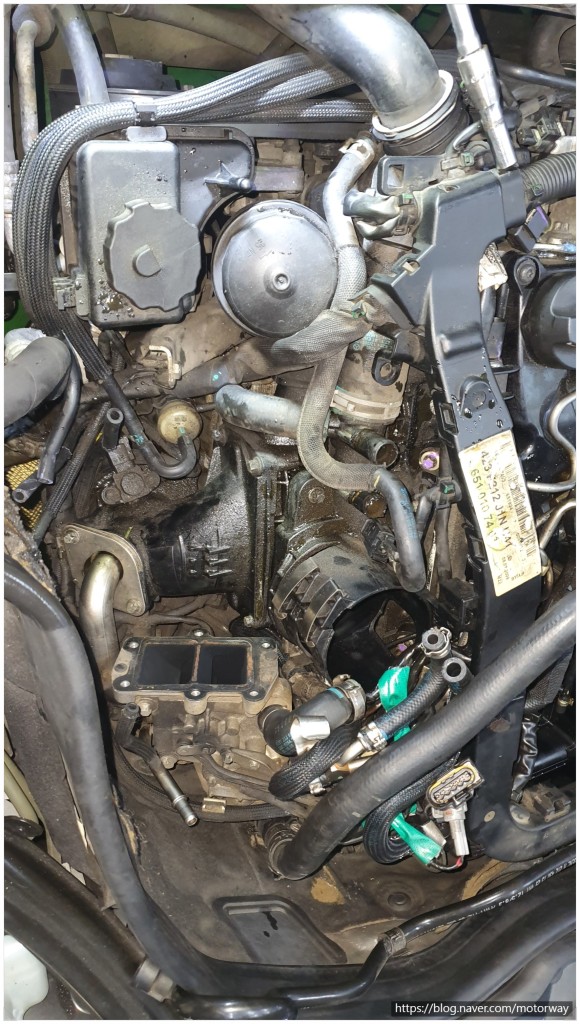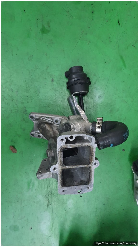 ST모터스에 점검을 하여 보니 , 흡기플랜모터와 냉각수파이프 누수, 흡기 카본이 너무 많이 쌓여 있어서 엔진이 제대로 작동을 못하여