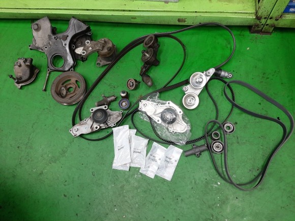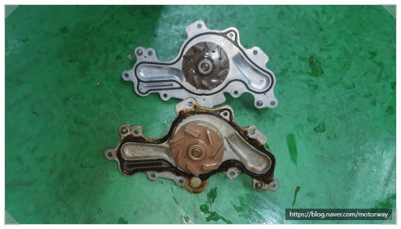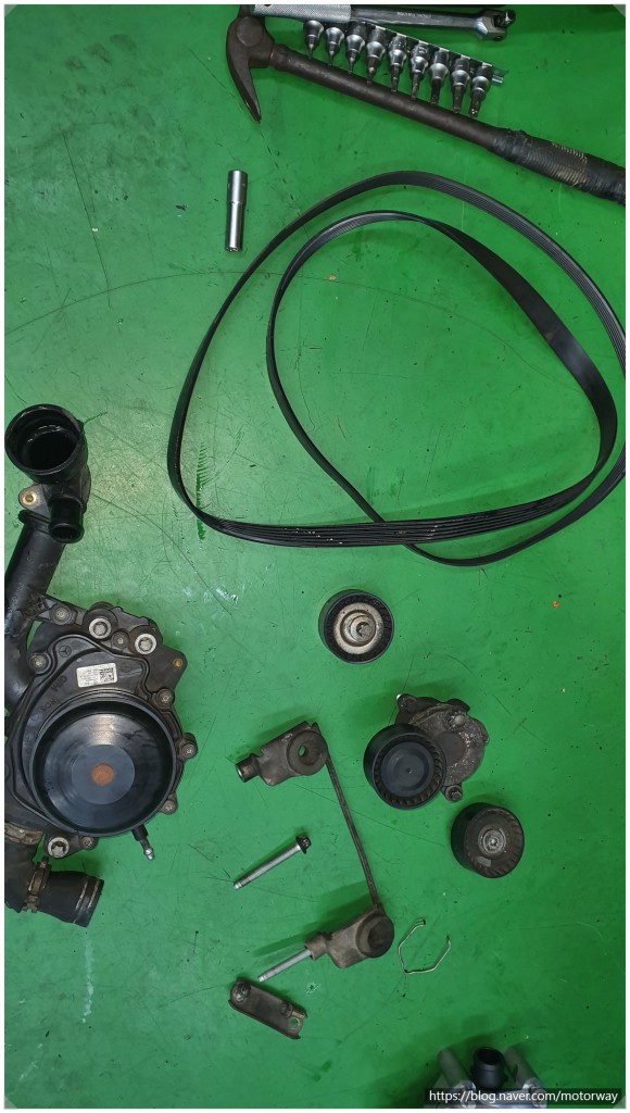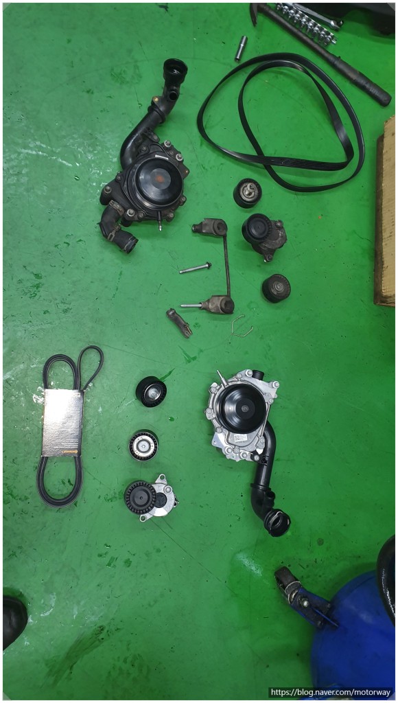 30 . 워터펌프와 휀벨트 텐션베어링 아이들베어링 탈거하여 신품과 구품 비교 사진